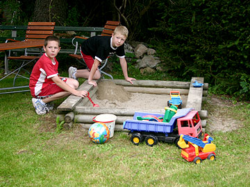 ein Spielplatz mit Schaukel, Sandkasten, Tischtennis, viel Platz für Fußball oder Federball sowie eine Liegewiese mit Liegestühlen zum Ausruhen und Entspannen. Ein Grill steht ebenfalls zur Verfügung.
